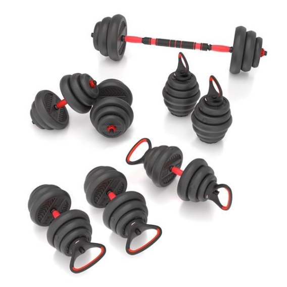 Dwa kettlebell: Talerze połóż na podstawkę i przykręć uchwyt do kettla. Ten zestaw umożliwia trening z jednym jak i dwoma kettlebell. Kettlebell to rodzaj ciężarka, który służy do wykonywania wielu rodzajów ćwiczeń, takich jak ćwiczenia balistyczne, które łączą trening cardio, siłowy i elastyczności. Ćwiczenia z kettlebell poprawiają także wydolność sercowo-naczyniową, koordynację, stabilność i wytrzymałość mięśniową.
